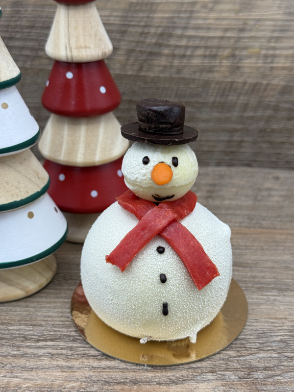 - LE BONHOMME DE NEIGE : Biscuit brownie noisette, mousse au Nutella, finition décoration Bonhomme de neige en chocolat et pâte d’amande