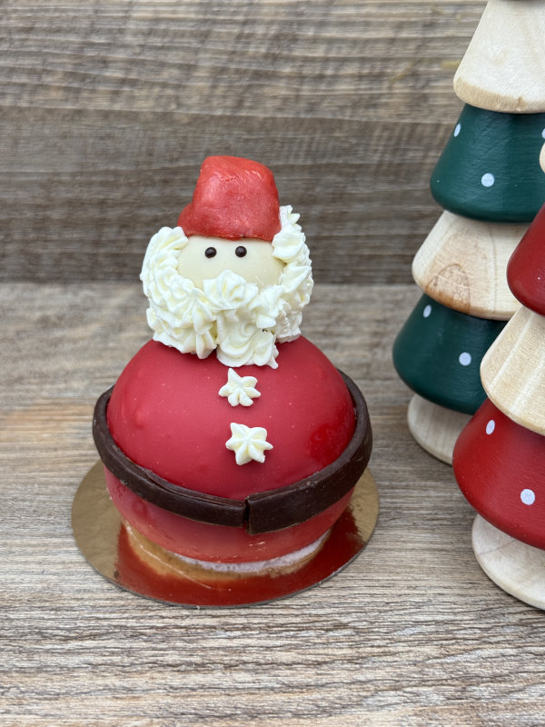 - LE PÈRE NOËL : Biscuit nature, mousse vanille, mousse fraise, finition décoration Père Noël en chocolat et pâte d’amande