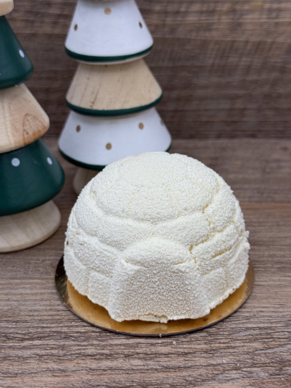 - L’IGLOO : Biscuit chocolat, mousse noix de coco et chocolat blanc, insert compotée d’ananas, finition décoration Igloo enneigé à la bombe velour blanche